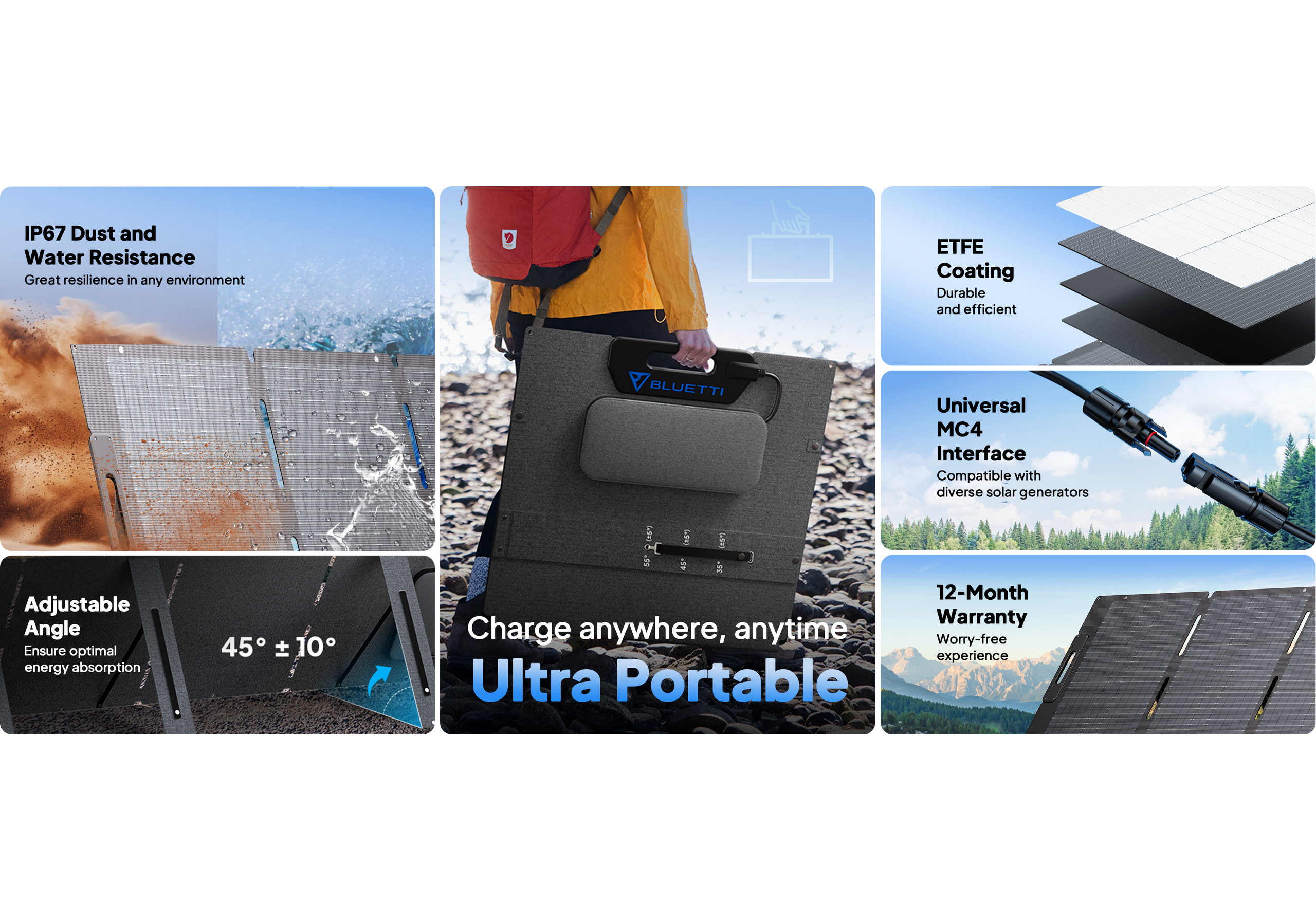 Thanks to the universal MC4 interface, the PV200D seamlessly integrates with a wide range of storage solutions available on the market. Simple plug and play to watch solar energy flow into your power station, making reliable and sustainable power within handy reach. * Compatible BLUETTI Models: EB3A / EB55 / EB70 / AC2A / AC50B / AC60 / AC70 / AC180 / AC80T/ AC200L / AC200P / AC200MAX / AC300 / AC500 / EP500Pro / B80 / B210 / B230 / B300 / MultiCooler