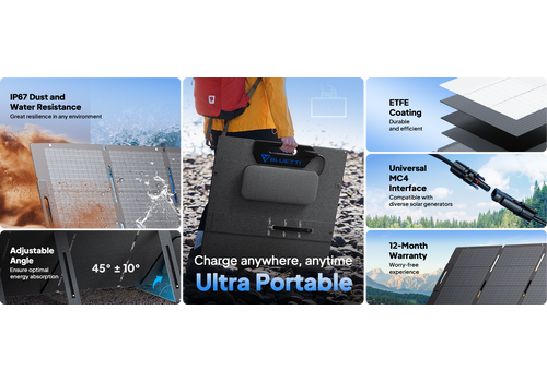 Introducing the BLUETTI PV200D Portable Solar Panel, your ultimate companion for off-grid adventures and sustainable energy solutions. Harness the power of the sun with its impressive 200W solar capacity and up to 23.4% conversion rate, enabling efficient charging of your solar generators while minimizing environmental impact.Whether you're camping in the wilderness, exploring the great outdoors, or preparing for emergencies with limited access to electricity, the BLUETTI PV200D ensures you stay powered up wherever you go!