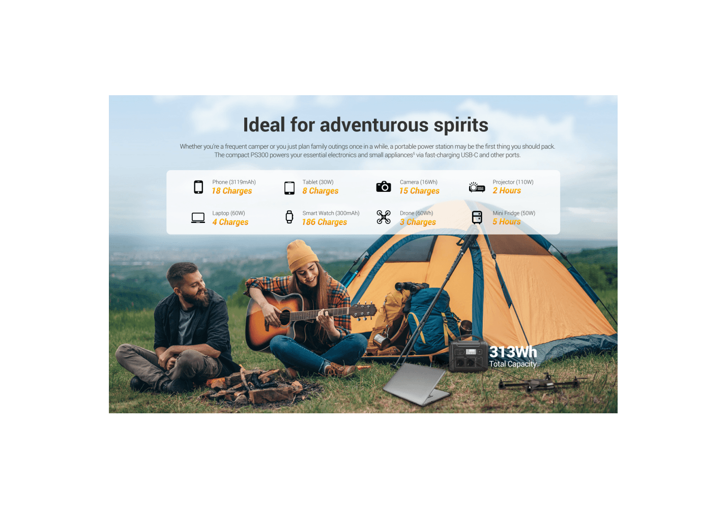 - Multi-Device Charging: The PS300 features four types of ports for charging multiple devices simultaneously, including USB-C fast charging. With its solar panel recharging support, you can even power your devices with green energy sources.