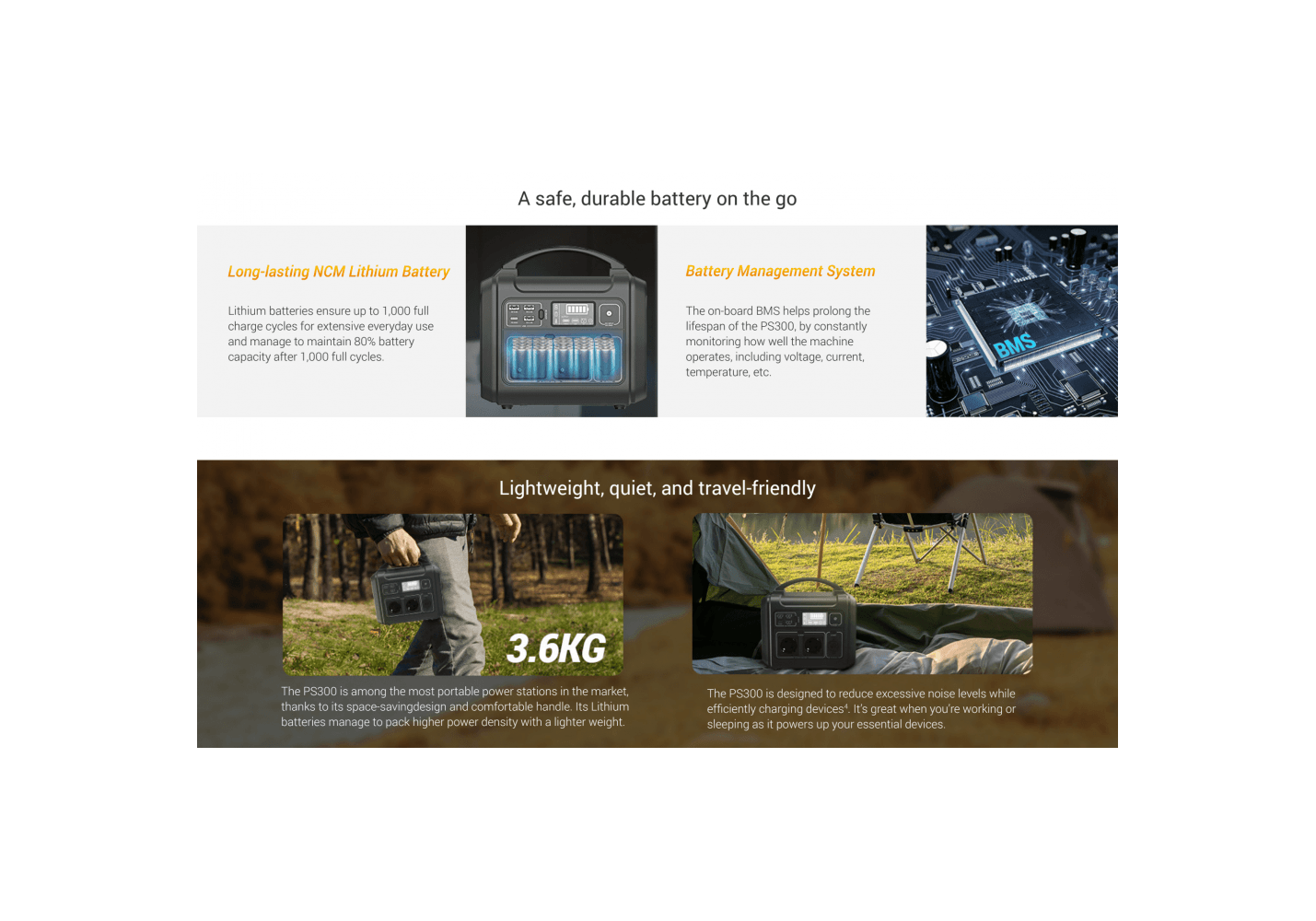 - Noise Reduction Technology: Enjoy efficient charging of your devices without the hassle of excessive noise levels. The PS300 is designed to reduce noise levels while efficiently charging your devices.